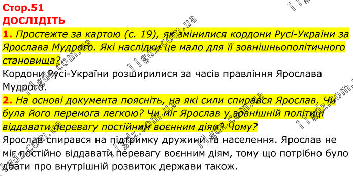 ДОСЛІДІТЬ 1. Простежте за картою (с. 19), як змінилися кордони Русі-України за Ярослава Мудрого. Які наслідки це мало для її зовнішньополітичного становища? Кордони Русі-України розширилися за часів правління Ярослава Мудрого. 2. На основі документа поясніть, на які сили спирався Ярослав. Чи була його перемога легкою? Чи міг Ярослав у зовнішній політиці віддавати перевагу постійним воєнним діям? Чому? Ярослав спирався на підтримку дружини та населення. Ярослав не міг постійно віддавати перевагу воєнним діям, тому що потрібно було дбати про внутрішній розвиток держави також.