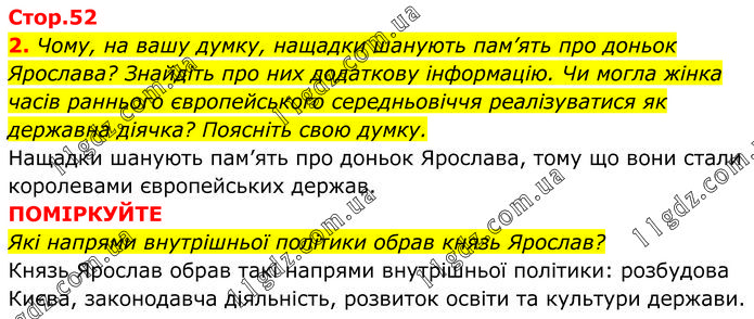 2. Чому, на вашу думку, нащадки шанують пам’ять про доньок Ярослава? Знайдіть про них додаткову інформацію. Чи могла жінка часів раннього європейського середньовіччя реалізуватися як державна діячка? Поясніть свою думку. Нащадки шанують пам’ять про доньок Ярослава, тому що вони стали королевами європейських держав. ПОМІРКУЙТЕ Які напрями внутрішньої політики обрав князь Ярослав? Князь Ярослав обрав такі напрями внутрішньої політики: розбудова Києва, законодавча діяльність, розвиток освіти та культури держави.
