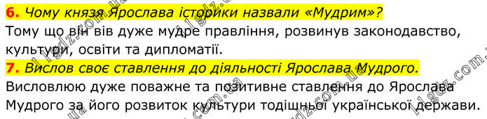 6. Чому князя Ярослава історики назвали «Мудрим»? Тому що він вів дуже мудре правління, розвинув законодавство, культури, освіти та дипломатії. 7. Вислов своє ставлення до діяльності Ярослава Мудрого. Висловлюю дуже поважне та позитивне ставлення до Ярослава Мудрого за його розвиток культури тодішньої української держави.