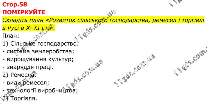 ПОМІРКУЙТЕ Складіть план «Розвиток сільського господарства, ремесел і торгівлі в Русі в Х–ХІ ст.». План: 1) Сільське господарство. - система землеробства; - вирощування культур; - знаряддя праці. 2) Ремесла. - види ремесел; - технології виробництва; 3) Торгівля.