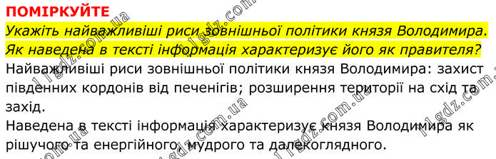 ПОМІРКУЙТЕ Укажіть найважливіші риси зовнішньої політики князя Володимира. Як наведена в тексті інформація характеризує його як правителя? Найважливіші риси зовнішньої політики князя Володимира: захист південних кордонів від печенігів; розширення території на схід та захід. Наведена в тексті інформація характеризує князя Володимира як рішучого та енергійного, мудрого та далекоглядного.