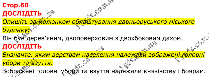 ДОСЛІДІТЬ Опишіть за малюнком облаштування давньоруського міського будинку. Він був дерев’яним, двоповерховим з двохбоковим дахом. ДОСЛІДІТЬ Визначте, яким верствам населення належали зображені головні убори та взуття. Зображені головні убори та взуття належали князівству і боярам.