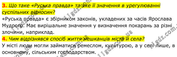 3. Що таке «Руська правда» та яке її значення в урегулюванні суспільних відносин? «Руська правда» є збірником законів, укладених за часів Ярослава Мудрого. Має вирішальне значення у визначення покарань за різні злочини, наприклад. 4. Чим відрізнявся спосіб життя мешканців міста й села? У місті люди могли займатися ремеслом, культурою, а у селі лише, в основному, сільським господарством.