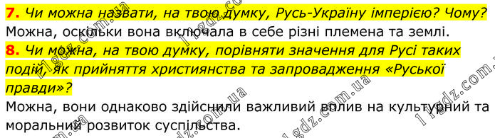 7. Чи можна назвати, на твою думку, Русь-Україну імперією? Чому? Можна, оскільки вона включала в себе різні племена та землі. 8. Чи можна, на твою думку, порівняти значення для Русі таких подій, як прийняття християнства та запровадження «Руської правди»? Можна, вони однаково здійснили важливий вплив на культурний та моральний розвиток суспільства.