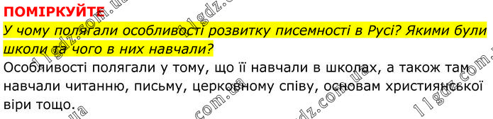 ПОМІРКУЙТЕ У чому полягали особливості розвитку писемності в Русі? Якими були школи та чого в них навчали? Особливості полягали у тому, що її навчали в школах, а також там навчали читанню, письму, церковному співу, основам християнської віри тощо.