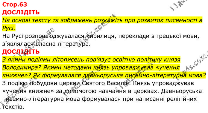 ДОСЛІДІТЬ На основі тексту та зображень розкажіть про розвиток писемності в Русі. На Русі розповсюджувалася кирилиця, переклади з грецької мови, з’являлася власна література. ДОСЛІДІТЬ З якими подіями літописець пов’язує освітню політику князя Володимира? Якими методами князь упроваджував «учення книжне»? Як формувалася давньоруська писемно-літературна мова? З подією побудови церкви Святого Василія. Князь упроваджував «учення книжне» за допомогою навчання в церквах. Давньоруська писемно-літературна мова формувалася при написанні релігійних текстів.