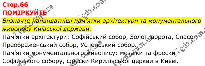 ПОМІРКУЙТЕ Визначте найвидатніші пам’ятки архітектури та монументального живопису Київської держави. Пам’ятки архітектури: Софійський собор, Золоті ворота, Спасо-Преображенський собор, Успенський собор. Пам’ятки монументального живопису: мозаїки та фрески Софійського собору, фрески Кирилівської церкви в Києві.
