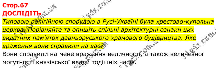 ДОСЛІДІТЬ Типовою релігійною спорудою в Русі-Україні була хрестово-купольна церква. Порівняйте та опишіть спільні архітектурні ознаки цих видатних пам’яток давньоруського храмового будівництва. Яке враження вони справили на вас? Вони справили на мене враження величності, а також величезної могутності князівської влади тодішніх часів.