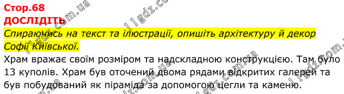 ДОСЛІДІТЬ Спираючись на текст та ілюстрації, опишіть архітектуру й декор Софії Київської. Храм вражає своїм розміром та надскладною конструкцією. Там було 13 куполів. Храм був оточений двома рядами відкритих галерей та був побудований як піраміда за допомогою цегли та каменю.