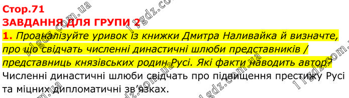 ЗАВДАННЯ ДЛЯ ГРУПИ 2 1. Проаналізуйте уривок із книжки Дмитра Наливайка й визначте, про що свідчать численні династичні шлюби представників / представниць князівських родин Русі. Які факти наводить автор? Численні династичні шлюби свідчать про підвищення престижу Русі та міцних дипломатичні зв’язках.