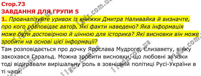 ЗАВДАННЯ ДЛЯ ГРУПИ 5 1. Проаналізуйте уривок із книжки Дмитра Наливайка й визначте, про кого розповідає автор. Які факти наведено? Яка інформація може бути достовірною й цінною для історика? Які висновки він може зробити на основі цієї інформації? Там розповідається про дочку Ярослава Мудрого, Єлизавету, в яку закохався Гаральд. Можна зробити висновки, що любовні зв’язки тоді відігравали вирішальну роль в зовнішній політиці Русі-України в ті часи.