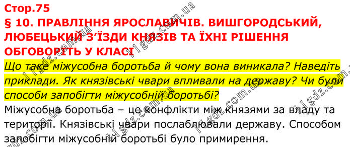§ 10. ПРАВЛІННЯ ЯРОСЛАВИЧІВ. ВИШГОРОДСЬКИЙ, ЛЮБЕЦЬКИЙ З’ЇЗДИ КНЯЗІВ ТА ЇХНІ РІШЕННЯ ОБГОВОРІТЬ У КЛАСІ Що таке міжусобна боротьба й чому вона виникала? Наведіть приклади. Як князівські чвари впливали на державу? Чи були способи запобігти міжусобній боротьбі? Міжусобна боротьба – це конфлікти між князями за владу та території. Князівські чвари послаблювали державу. Способом запобігти міжусобній боротьбі було примирення.