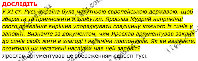 ДОСЛІДІТЬ У ХІ ст. Русь-Україна була могутньою європейською державою. Щоб зберегти та примножити її здобутки, Ярослав Мудрий наприкінці свого правління вирішив упорядкувати спадщину кожного із синів у заповіті. Визначте за документом, чим Ярослав аргументував заклик до синів своїх жити в злагоді і які зміни пропонував. Як ви вважаєте, позитивні чи негативні наслідки мав цей заповіт? Ярослав аргументував це збереженням єдності Русі.