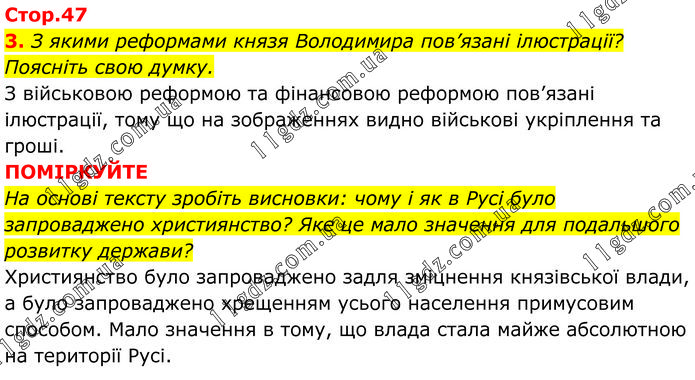 3. З якими реформами князя Володимира пов’язані ілюстрації? Поясніть свою думку. З військовою реформою та фінансовою реформою пов’язані ілюстрації, тому що на зображеннях видно військові укріплення та гроші. ПОМІРКУЙТЕ На основі тексту зробіть висновки: чому і як в Русі було запроваджено християнство? Яке це мало значення для подальшого розвитку держави? Християнство було запроваджено задля зміцнення князівської влади, а було запроваджено хрещенням усього населення примусовим способом. Мало значення в тому, що влада стала майже абсолютною на території Русі.