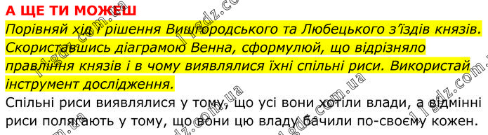 А ЩЕ ТИ МОЖЕШ Порівняй хід і рішення Вишгородського та Любецького з’їздів князів. Скориставшись діаграмою Венна, сформулюй, що відрізняло правління князів і в чому виявлялися їхні спільні риси. Використай інструмент дослідження. Спільні риси виявлялися у тому, що усі вони хотіли влади, а відмінні риси полягають у тому, що вони цю владу бачили по-своєму кожен.