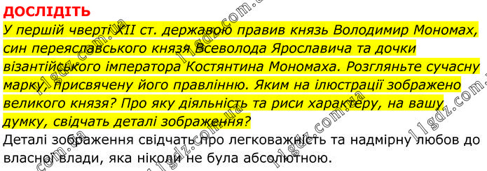 ДОСЛІДІТЬ У першій чверті ХІІ ст. державою правив князь Володимир Мономах, син переяславського князя Всеволода Ярославича та дочки візантійського імператора Костянтина Мономаха. Розгляньте сучасну марку, присвячену його правлінню. Яким на ілюстрації зображено великого князя? Про яку діяльність та риси характеру, на вашу думку, свідчать деталі зображення? Деталі зображення свідчать про легковажність та надмірну любов до власної влади, яка ніколи не була абсолютною.