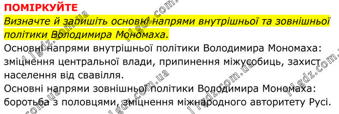 ПОМІРКУЙТЕ Визначте й запишіть основні напрями внутрішньої та зовнішньої політики Володимира Мономаха. Основні напрями внутрішньої політики Володимира Мономаха: зміцнення центральної влади, припинення міжусобиць, захист населення від свавілля. Основні напрями зовнішньої політики Володимира Мономаха: боротьба з половцями, зміцнення міжнародного авторитету Русі.