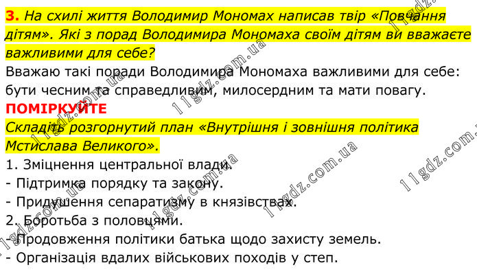 3. На схилі життя Володимир Мономах написав твір «Повчання дітям». Які з порад Володимира Мономаха своїм дітям ви вважаєте важливими для себе? Вважаю такі поради Володимира Мономаха важливими для себе: бути чесним та справедливим, милосердним та мати повагу. ПОМІРКУЙТЕ Складіть розгорнутий план «Внутрішня і зовнішня політика Мстислава Великого». 1. Зміцнення центральної влади. - Підтримка порядку та закону. - Придушення сепаратизму в князівствах. 2. Боротьба з половцями. - Продовження політики батька щодо захисту земель. - Організація вдалих військових походів у степ.