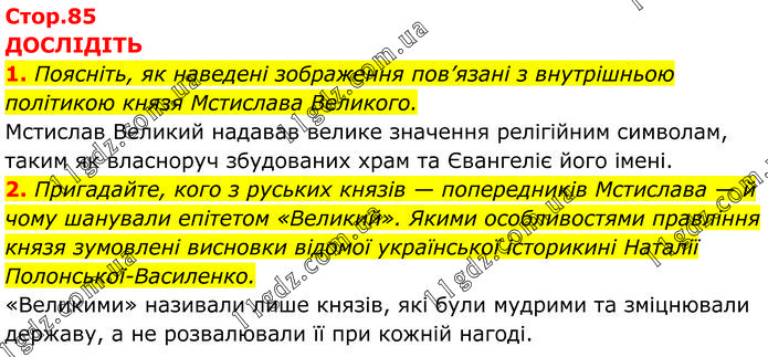 ДОСЛІДІТЬ 1. Поясніть, як наведені зображення пов’язані з внутрішньою політикою князя Мстислава Великого. Мстислав Великий надавав велике значення релігійним символам, таким як власноруч збудованих храм та Євангеліє його імені. 2. Пригадайте, кого з руських князів — попередників Мстислава — й чому шанували епітетом «Великий». Якими особливостями правління князя зумовлені висновки відомої української історикині Наталії Полонської-Василенко. «Великими» називали лише князів, які були мудрими та зміцнювали державу, а не розвалювали її при кожній нагоді.