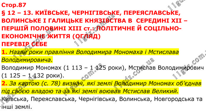 § 12 – 13. КИЇВСЬКЕ, ЧЕРНІГІВСЬКЕ, ПЕРЕЯСЛАВСЬКЕ, ВОЛИНСЬКЕ І ГАЛИЦЬКЕ КНЯЗІВСТВА В СЕРЕДИНІ XII – ПЕРШІЙ ПОЛОВИНІ XIII ст.: ПОЛІТИЧНЕ Й СОЦІЛЬНО-ЕКОНОМІЧНЕ ЖИТТЯ (ОГЛЯД) ПЕРЕВІР СЕБЕ 1. Назви роки правління Володимира Мономаха і Мстислава Володимировича. Володимир Мономах (1 113 – 1 125 роки), Мстислав Володимирович (1 125 – 1 132 роки). 2. За картою (с. 78) визнач, які землі Володимир Мономах об’єднав під своєю владою та за які землі воював Мстислав Великий. Київська, Переяславська, Чернігівська, Волинська, Новгородська та інші землі.