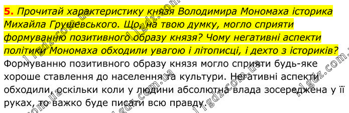 Прочитай характеристику князя Володимира Мономаха історика Михайла Грушевського. Що, на твою думку, могло сприяти формуванню позитивного образу князя? Чому негативні аспекти політики Мономаха обходили увагою і літописці, і дехто з істориків? Формуванню позитивного образу князя могло сприяти будь-яке хороше ставлення до населення та культури. Негативні аспекти обходили, оскільки коли у людини абсолютна влада зосереджена у її руках, то важко буде писати всю правду.