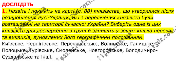 ДОСЛІДІТЬ 1. Назвіть і покажіть на карті (с. 88) князівства, що утворилися після роздроблення Русі-України. Які з перелічених князівств були розташовані на території сучасної України? Виберіть одне із цих князівств для дослідження в групі й запишіть у зошит кілька переваг та викликів, зумовлених його географічним положенням. Київське, Чернігівське, Переяславське, Волинське, Галицьке, Полоцьке, Турівське, Смоленське, Новгородське, Володимиро-Суздальське та інші.