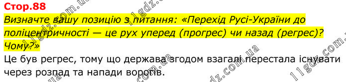 Визначте вашу позицію з питання: «Перехід Русі-України до поліцентричності — це рух уперед (прогрес) чи назад (регрес)? Чому?» Це був регрес, тому що держава згодом взагалі перестала існувати через розпад та напади ворогів.
