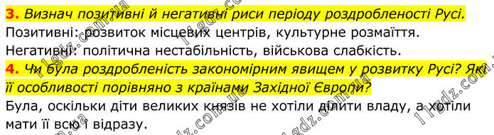 3. Визнач позитивні й негативні риси періоду роздробленості Русі. Позитивні: розвиток місцевих центрів, культурне розмаїття. Негативні: політична нестабільність, військова слабкість. 4. Чи була роздробленість закономірним явищем у розвитку Русі? Які її особливості порівняно з країнами Західної Європи? Була, оскільки діти великих князів не хотіли ділити владу, а хотіли мати її всю і відразу.