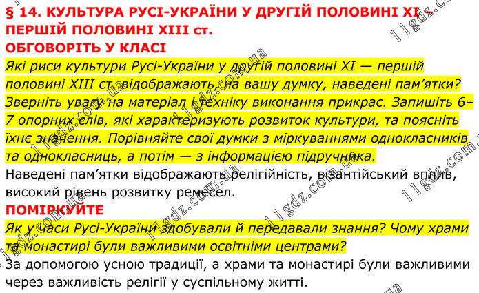 § 14. КУЛЬТУРА РУСІ-УКРАЇНИ У ДРУГІЙ ПОЛОВИНІ XI – ПЕРШІЙ ПОЛОВИНІ XIII ст. ОБГОВОРІТЬ У КЛАСІ Які риси культури Русі-України у другій половині ХІ — першій половині ХІІІ ст. відображають, на вашу думку, наведені пам’ятки? Зверніть увагу на матеріал і техніку виконання прикрас. Запишіть 6–7 опорних слів, які характеризують розвиток культури, та поясніть їхнє значення. Порівняйте свої думки з міркуваннями однокласників та однокласниць, а потім — з інформацією підручника. Наведені пам’ятки відображають релігійність, візантійський вплив, високий рівень розвитку ремесел. ПОМІРКУЙТЕ Як у часи Русі-України здобували й передавали знання? Чому храми та монастирі були важливими освітніми центрами? За допомогою усною традиції, а храми та монастирі були важливими через важливість релігії у суспільному житті.