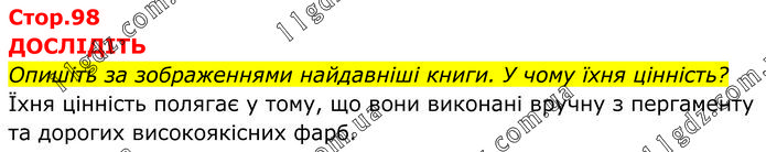 ДОСЛІДІТЬ Опишіть за зображеннями найдавніші книги. У чому їхня цінність? Їхня цінність полягає у тому, що вони виконані вручну з пергаменту та дорогих високоякісних фарб.