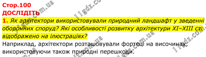 ДОСЛІДІТЬ 1. Як архітектори використовували природний ландшафт у зведенні оборонних споруд? Які особливості розвитку архітектури ХІ–ХІІІ ст. відображено на ілюстраціях? Наприклад, архітектори розташовували фортеці на височинах, використовуючи також природні перешкоди.