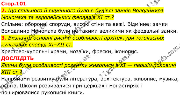 2. Що спільного й відмінного було в будівлі замків Володимира Мономаха та європейських феодалів ХІ ст.? Спільне: оборонні споруди, високі стіни та вежі. Відмінне: замки Володимир Мономаха були не такими великими як феодальні замки. 3. Визначте основні риси й особливості архітектури тогочасних культових споруд ХІ–ХІІ ст. Хрестово-купольні храми, мозаїки, фрески, іконопис. ДОСЛІДІТЬ Якими були особливості розвитку живопису в ХІ — першій половині ХІІІ ст.? Напрямами розвитку були література, архітектура, живопис, музика, освіта. Школи розвивалися при церквах і монастирях і поширювалися рукописні книги.