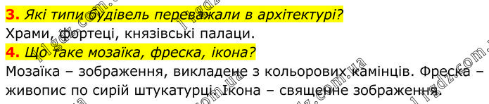 3. Які типи будівель переважали в архітектурі? Храми, фортеці, князівські палаци. 4. Що таке мозаїка, фреска, ікона? Мозаїка – зображення, викладене з кольорових камінців. Фреска – живопис по сирій штукатурці. Ікона – священне зображення.