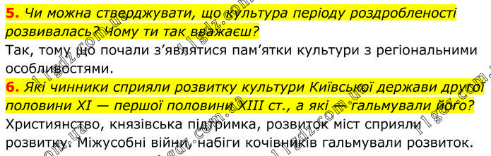 5. Чи можна стверджувати, що культура періоду роздробленості розвивалась? Чому ти так вважаєш? Так, тому що почали з’являтися пам’ятки культури з регіональними особливостями. 6. Які чинники сприяли розвитку культури Київської держави другої половини ХІ — першої половини ХІІІ ст., а які — гальмували його? Християнство, князівська підтримка, розвиток міст сприяли розвитку. Міжусобні війни, набіги кочівників гальмували розвиток.