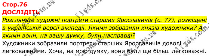 ДОСЛІДІТЬ Розгляньте художні портрети старших Ярославичів (с. 77), розміщені в українській версії вікіпедії. Якими зобразили князів художники? А якими вони, на вашу думку, були насправді? Художники зобразили портрети старших Ярославичів доволі легковажними. Хоча, на мою думку, вони були ще більш легковажні.