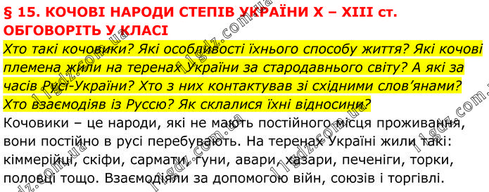 § 15. КОЧОВІ НАРОДИ СТЕПІВ УКРАЇНИ X – XIII ст. ОБГОВОРІТЬ У КЛАСІ Хто такі кочовики? Які особливості їхнього способу життя? Які кочові племена жили на теренах України за стародавнього світу? А які за часів Русі-України? Хто з них контактував зі східними слов’янами? Хто взаємодіяв із Руссю? Як склалися їхні відносини? Кочовики – це народи, які не мають постійного місця проживання, вони постійно в русі перебувають. На теренах Україні жили такі: кіммерійці, скіфи, сармати, гуни, авари, хазари, печеніги, торки, половці тощо. Взаємодіяли за допомогою війн, союзів і торгівлі.