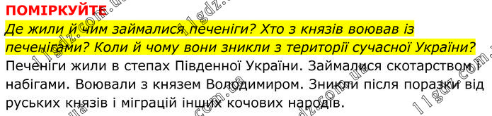ПОМІРКУЙТЕ Де жили й чим займалися печеніги? Хто з князів воював із печенігами? Коли й чому вони зникли з території сучасної України? Печеніги жили в степах Південної України. Займалися скотарством і набігами. Воювали з князем Володимиром. Зникли після поразки від руських князів і міграцій інших кочових народів.