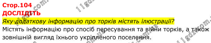 ДОСЛІДІТЬ Яку додаткову інформацію про торків містять ілюстрації? Містять інформацію про спосіб пересування та війни торків, а також зовнішній вигляд їхнього укріпленого поселення.
