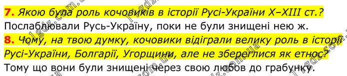 7. Якою була роль кочовиків в історії Русі-України X–XIII ст.? Послаблювали Русь-Україну, поки не були знищені нею ж. 8. Чому, на твою думку, кочовики відіграли велику роль в історії Русі-України, Болгарії, Угорщини, але не збереглися як етнос? Тому що вони були знищені через свою любов до грабунку.