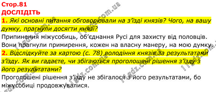 ДОСЛІДІТЬ 1. Які основні питання обговорювали на з’їзді князів? Чого, на вашу думку, прагнули досягти князі? Припинення міжусобиць, об’єднання Русі для захисту від половців. Вони прагнули примирення, кожен на власну манеру, на мою думку. 2. Відслідкуйте за картою (с. 78) володіння князів за результатами з’їзду. Як ви гадаєте, чи збігаються проголошені рішення з’їзду з його результатами? Проголошені рішення з’їзду не збігалося з його результатами, бо міжусобиці продовжувалися.