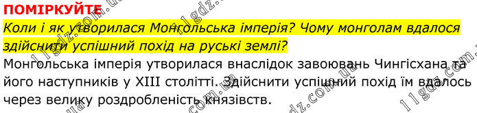 ПОМІРКУЙТЕ Коли і як утворилася Монгольська імперія? Чому монголам вдалося здійснити успішний похід на руські землі? Монгольська імперія утворилася внаслідок завоювань Чингісхана та його наступників у XIII столітті. Здійснити успішний похід їм вдалось через велику роздробленість князівств.