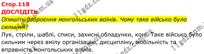ДОСЛІДІТЬ Опишіть озброєння монгольських воїнів. Чому таке військо було сильним? Лук, стріли, шаблі, списи, захисні обладунки, коні. Таке військо було сильним через вмілу організацію, дисципліну, мобільність та вправність монгольських воїнів.