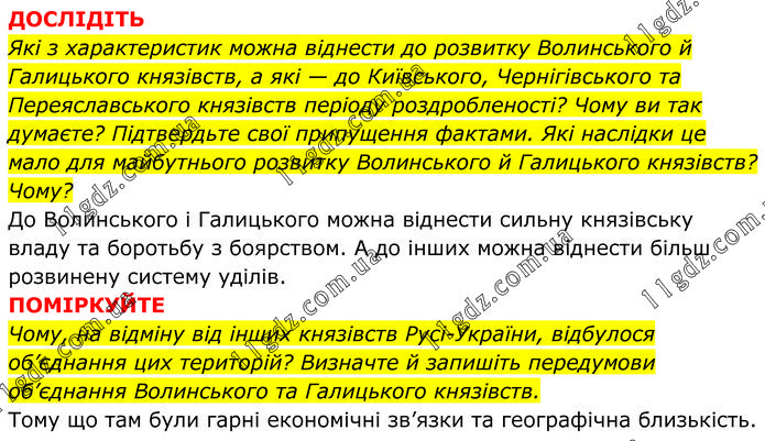 ДОСЛІДІТЬ Які з характеристик можна віднести до розвитку Волинського й Галицького князівств, а які — до Київського, Чернігівського та Переяславського князівств періоду роздробленості? Чому ви так думаєте? Підтвердьте свої припущення фактами. Які наслідки це мало для майбутнього розвитку Волинського й Галицького князівств? Чому? До Волинського і Галицького можна віднести сильну князівську владу та боротьбу з боярством. А до інших можна віднести більш розвинену систему уділів. ПОМІРКУЙТЕ Чому, на відміну від інших князівств Русі-України, відбулося об’єднання цих територій? Визначте й запишіть передумови об’єднання Волинського та Галицького князівств. Тому що там були гарні економічні зв’язки та географічна близькість.