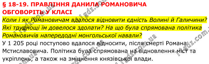 § 18-19. ПРАВЛІННЯ ДАНИЛА РОМАНОВИЧА ОБГОВОРІТЬ У КЛАСІ Коли і як Романовичам вдалося відновити єдність Волині й Галичини? Які труднощі їм довелося здолати? На що була спрямована політика Романовичів напередодні монгольської навали? У 1 205 році поступово вдалося відносити, після смерті Романа Мстиславовича. Політика була спрямована на відновлення міст та укріплень, а також на зміцнення князівської влади.