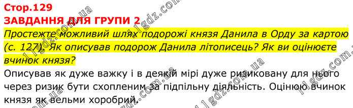 ЗАВДАННЯ ДЛЯ ГРУПИ 2 Простежте можливий шлях подорожі князя Данила в Орду за картою (с. 127). Як описував подорож Данила літописець? Як ви оцінюєте вчинок князя? Описував як дуже важку і в деякій мірі дуже ризиковану для нього через ризик бути схопленим за підпільну діяльність. Оцінюю вчинок князя як вельми хоробрий.