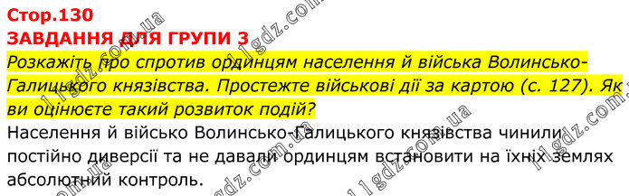ЗАВДАННЯ ДЛЯ ГРУПИ 3 Розкажіть про спротив ординцям населення й війська Волинсько-Галицького князівства. Простежте військові дії за картою (с. 127). Як ви оцінюєте такий розвиток подій? Населення й військо Волинсько-Галицького князівства чинили постійно диверсії та не давали ординцям встановити на їхніх землях абсолютний контроль.