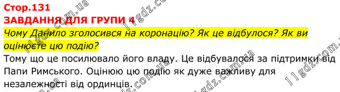 ЗАВДАННЯ ДЛЯ ГРУПИ 4 Чому Данило зголосився на коронацію? Як це відбулося? Як ви оцінюєте цю подію? Тому що це посилювало його владу. Це відбувалося за підтримки від Папи Римського. Оцінюю цю подію як дуже важливу для незалежності від ординців.