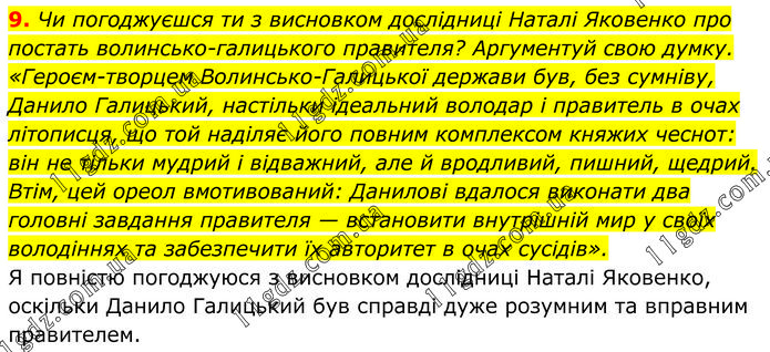 Чи погоджуєшся ти з висновком дослідниці Наталі Яковенко про постать волинсько-галицького правителя? Аргументуй свою думку. «Героєм-творцем Волинсько-Галицької держави був, без сумніву, Данило Галицький, настільки ідеальний володар і правитель в очах літописця, що той наділяє його повним комплексом княжих чеснот: він не тільки мудрий і відважний, але й вродливий, пишний, щедрий. Втім, цей ореол вмотивований: Данилові вдалося виконати два головні завдання правителя — встановити внутрішній мир у своїх володіннях та забезпечити їх авторитет в очах сусідів». Я повністю погоджуюся з висновком дослідниці Наталі Яковенко, оскільки Данило Галицький був справді дуже розумним та вправним правителем.