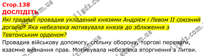 ДОСЛІДІТЬ Які традиції провадив укладений князями Андрієм і Левом II союзний договір? Яка небезпека мотивувала князів до зближення з Тевтонським орденом? Провадив військову допомогу, спільну оборону, торгові переваги, взаємне визнання прав. Мотивувала небезпека вторгнення з Литви.