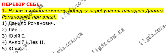 ПЕРЕВІР СЕБЕ 1. Назви в хронологічному порядку перебування нащадків Данила Романовича при владі. 1) Данило Романович. 2) Лев I. 3) Юрій I. 4) Анлрій і Лев II. 5) Юрій II.